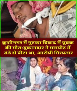 कुशीनगर के कसया थाना क्षेत्र में गुटखा को लेकर हुए विवाद में मुलायम चौहान (35) की डंडे से पीटकर हत्या