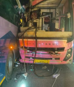 देर रात दो स्लीपर बसें एक्सप्रेस वे पर पलटे कंटेनर से टकराई ।